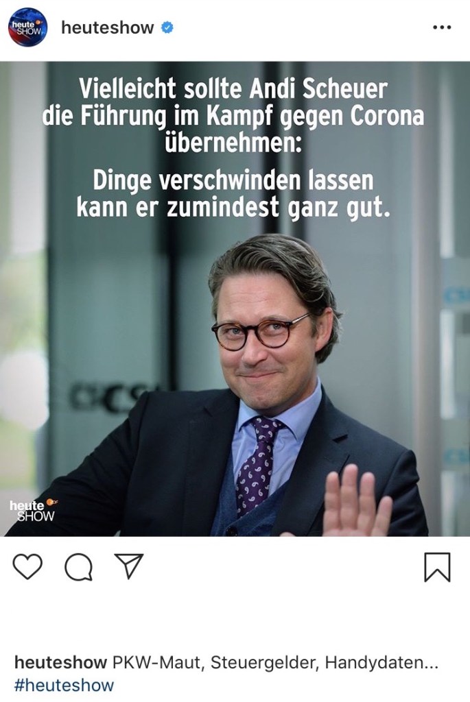 Als bekannte Beispiele können an dieser Stelle die heute-show oder Der Postillon genannt werden. Sie greifen die im öffentlichen Diskurs diskutierten Dinge auf und verbinden diese mit Humor. Die heute-show sieht den Verkehrsminister Andreas Scheuer weit vorne im Kampf gegen Corona, da er Dinge zumindest gut verschwinden lassen kann wie die Mautdebatte. Der Postillon titelt: „WHO bestätigt: Döner mit Knoblauchsoße und extra Zwiebeln schützt vor Corona-Ansteckung“.