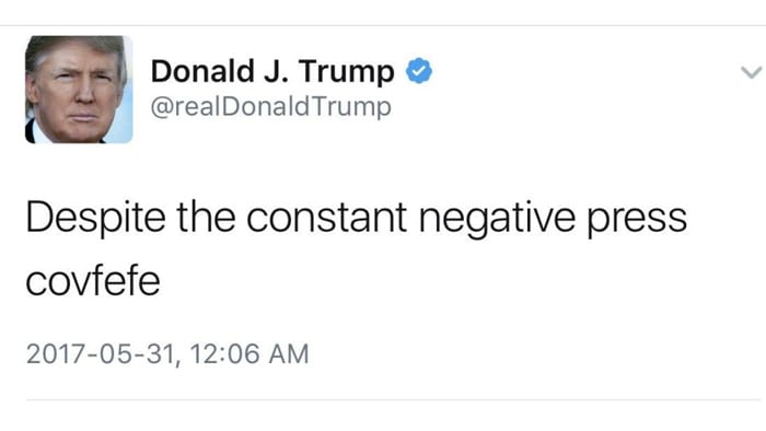 Nach ausgiebiger Recherche (ich hab den Wikipedia-Artikel zu Covfefe gelesen – ja, es gibt einen Wiki-Artikel dazu) fand ich heraus, dass mittlerweile davon ausgegangen wird, dass Trump eigentlich „coverage“ schreiben wollte. Die Trump-Administration hält sich wage, bestätigt nichts und meint, dass das Team aber wisse, was das bedeute. Dem Meme-Zug hat das (natürlich) keinen Halt geboten und „Covfefe“ bedeutet heute viel mehr, als vermutlich jemals intendiert war.