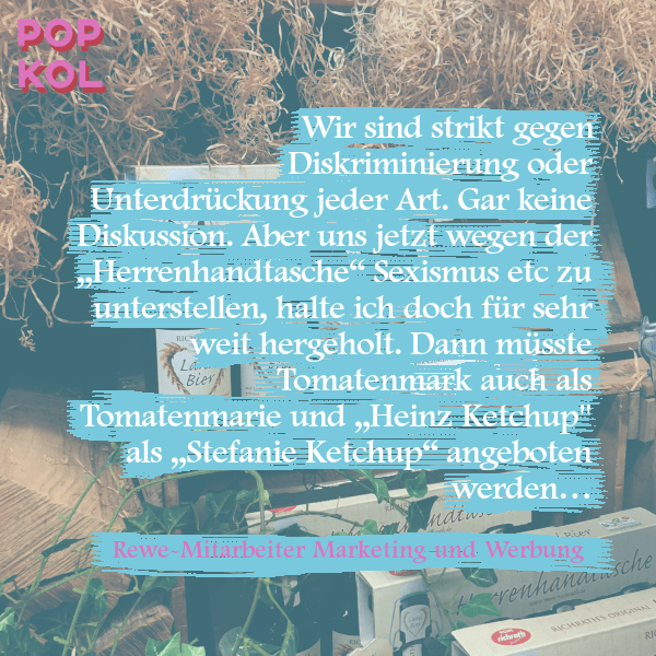 Dieser Artikel basiert auf eine Instagram-Posting. 2018 habe ich auf Grund stereotypisierter Werbung eine Mail an Rewe Richrath geschrieben. Den E-Mail Verlauf findet Ihr in den Bildern und meine Meinung dazu im Text. Ich war in Kontakt mit einem Mitarbeiter namens Lars aus der Marketing-Abteilung. Auch wenn dieser mit Namen angesprochen wird, geht es nicht um ihn als Individuum, sondern um diese Art von Mensch und Argumentation an sich. Weiß, männlich, vermutlich cis und vermutlich hetero. Spoiler Alert: Das kritisierte Produkt befindet sich weiterhin im Verkauf. Folgt gerne dem Text, dieser sagt Euch wann Ihr auf das nächste Bild klicken könnt.