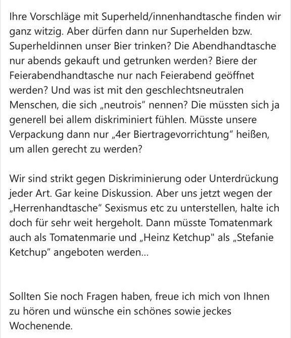 Kommen wir nur zum zweiten Absatz von Lars Erklärung (Klick für richtig gut recherchierte und reflektierte Argumentation). Diesen empfinde ich einfach als plump und respektlos. Und ein wenig Mansplaining ist auch dabei.. Yippie! Muss ich wirklich erklären, warum Heinz Ketchup und Tomatenmark nicht gegendert werden müssen? Schön, dass auch an andere diskriminierte Gruppen gedacht wird. Aber warum passiert das nur, wenn Frauen sich genderkritisch äußern? Kla-ssi-ker!