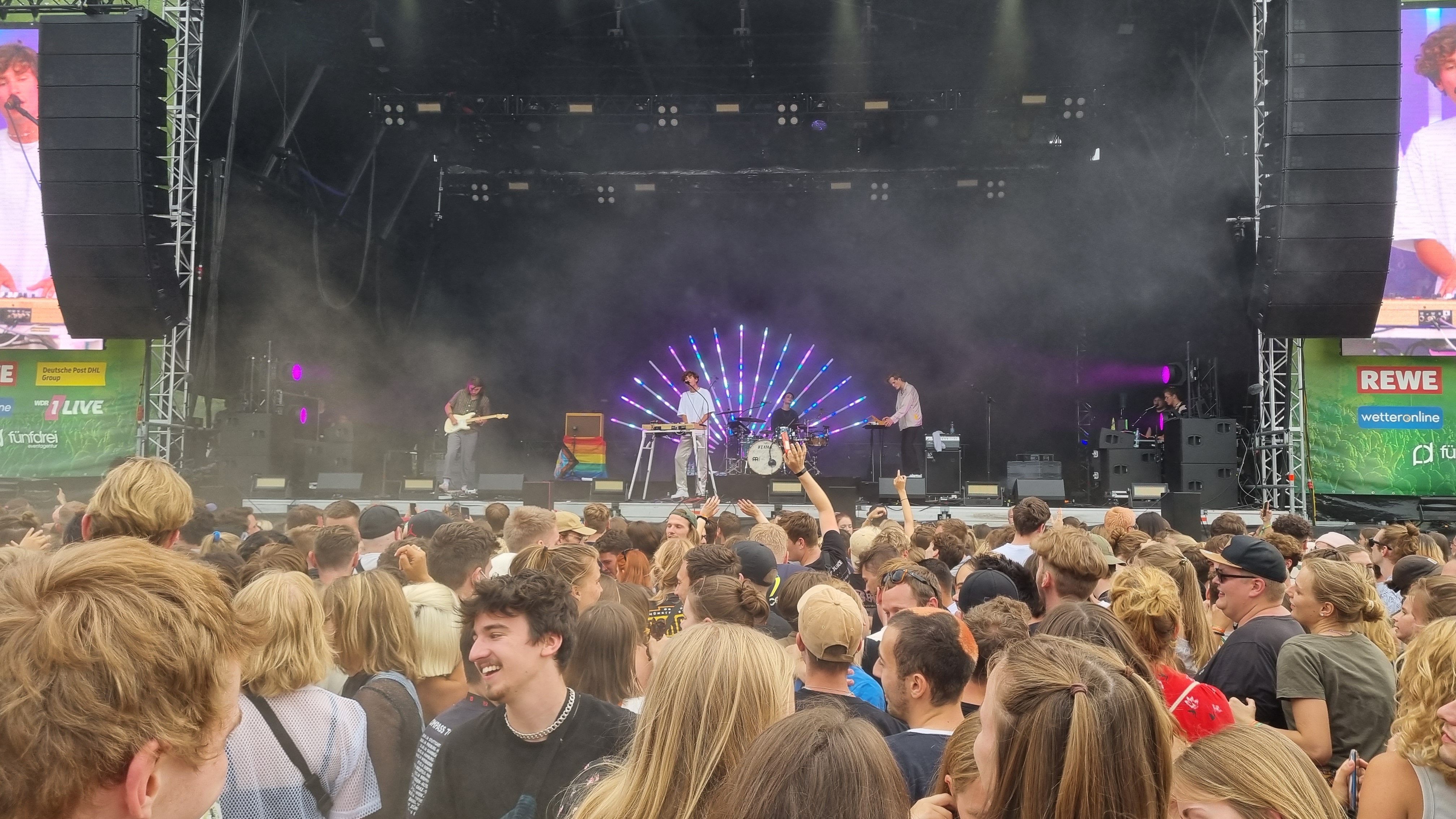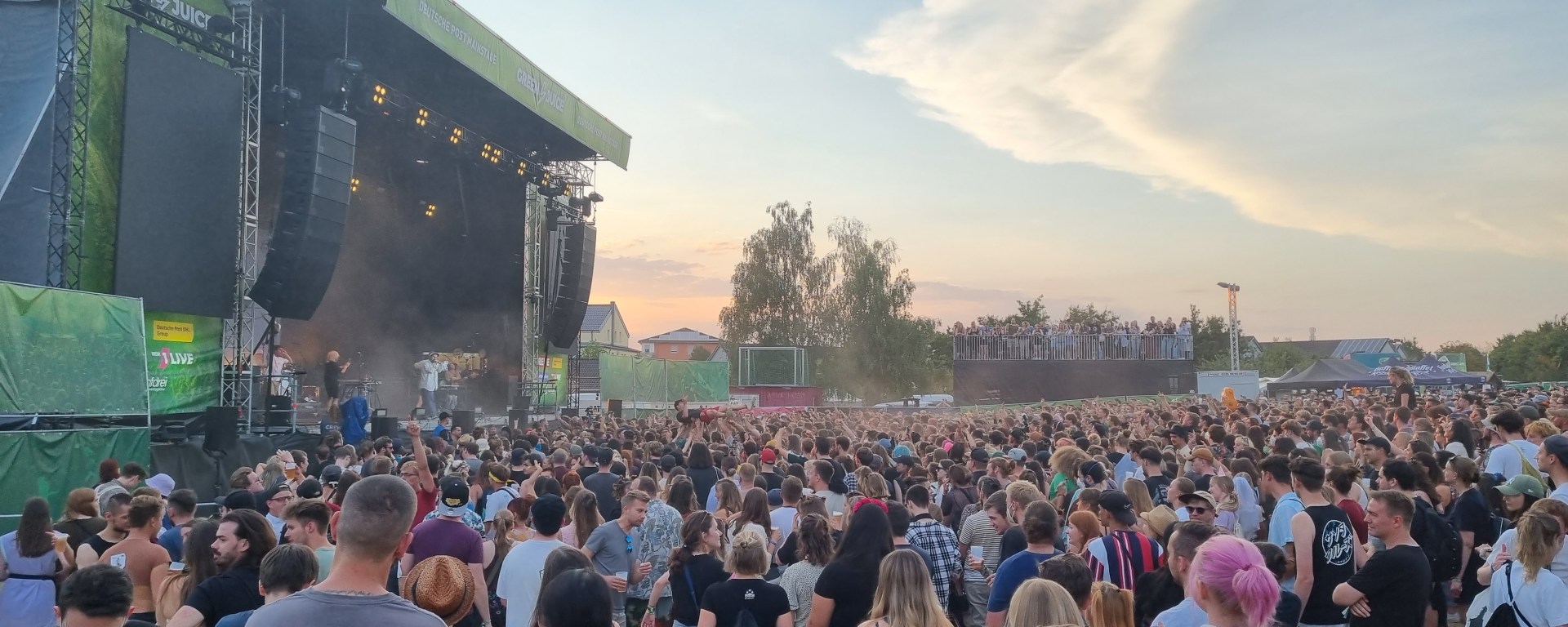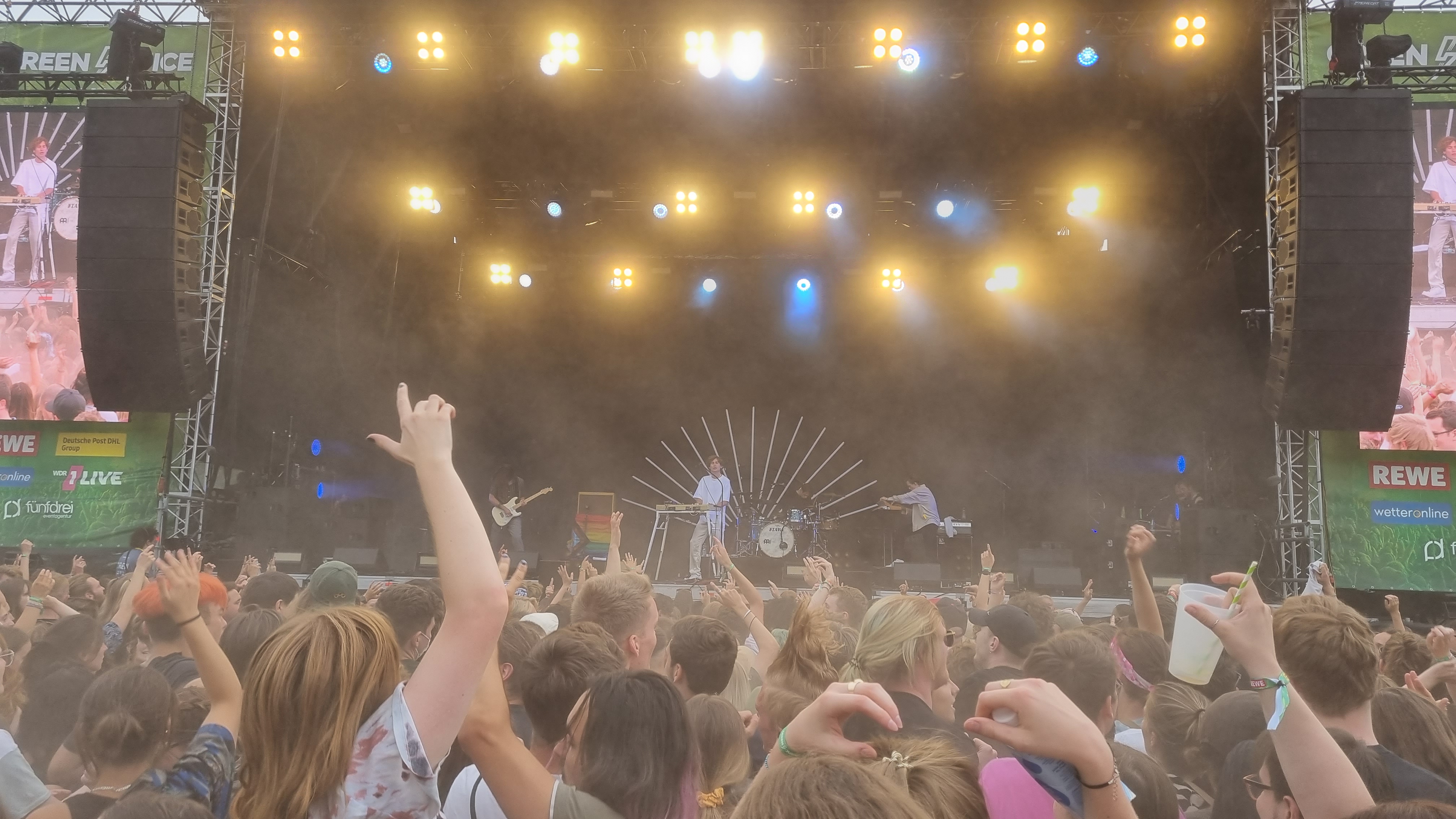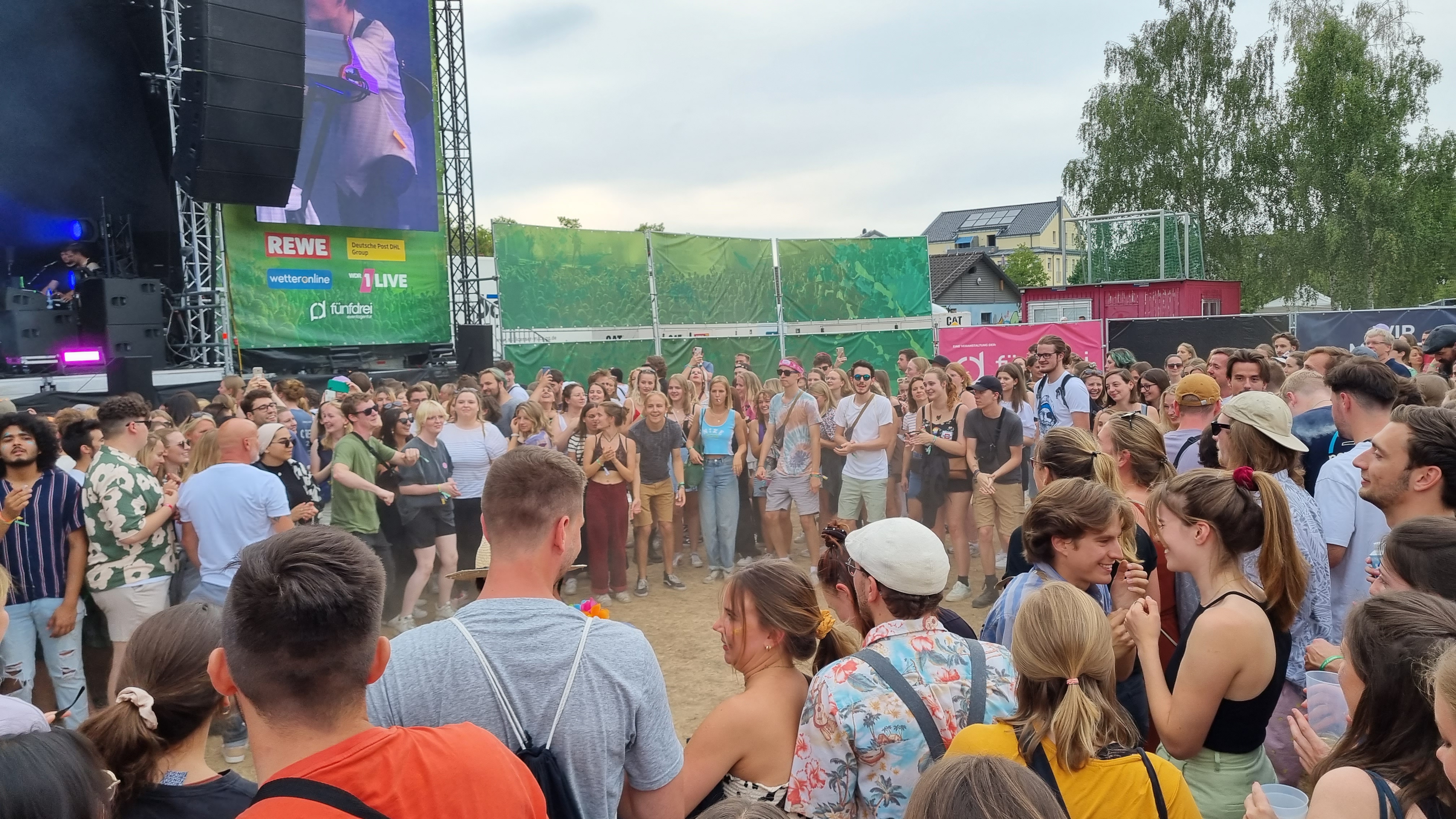Gestartet hat das Festival in der beschaulichen Reihenhaussiedlung mit der Sängerin Melé. Ihr Pop-Sound hat die Festivalbesucher:innen ordentlich zum Tanzen gebracht, auch wenn das Gelände sich erst langsam füllte. Ihr populärster Song „deine cousine“, den sie eigentlich nur als Joke released hat, brachte dann den ein oder anderen Fan zum Mitsingen. Nach ihrem Auftritt konnten die Zuschauer:innen weiter zur zweiten, kleineren Bühne. Bei Techno-Sounds ließen so einige dort ihrer Energie freien Lauf, hüpften im Takt und wirbelten den Staub vom Boden hoch. Da kam eine Abkühlung mit dem Wasserschlauch einigen ganz gelegen. Der zweite große Act des Tages war die Indie-Pop-Band Jeremias. Seit spätestens 2021 ist die Band mit ihrem Debüt-Album „golden hour“ bei den meisten Musik-Nerds bekannt. Besonders gut gefallen hat dem Publikum, dass die Band ihren neuen Hit „Unique“, noch vor der offiziellen Veröffentlichung, für sie spielte. Einen Song über Liebe, da kann man bei den jungen Männern mit Seidenhemd und Perlenkette schon mal schwach werden. Auf den Headliner des Festivals konnten sich die Zuschauenden schon am Donnerstagabend freuen: Beatsteaks. Mit ihrem Auftritt kamen auch deutlich mehr ältere Männer und rockig gekleidete Menschen vor die Bühne. Die Band kündigte zu Beginn des Auftritts an, dem Publikum „den Stock aus dem Arsch ziehen zu wollen“. Das schafften sie. Während die Band für ordentlich Stimmung sorgte, das Publikum immer wieder ihren Namen rief und sich Moshpits bildeten, ging hinter der Bühne langsam die Sonne unter. Der Frontsänger Arnim Teutoburg-Weiß suchte immer wieder Kontakt zum Publikum und hatte sichtlich Spaß, ordentlich einzuheizen. Während der Show wechselte er irgendwann sein Shirt in eins mit der Aufschrift „Lover“, tauschte seinen Samthut mit einem weißen Fischerhut und stimmte die Backstreet Boys an. Ein wilder Mix, den auch er schmunzelnd erkennen muss. Doch das Publikum ist genauso wild, wie er glücklich feststellte. Wie man sich beim Publikum beliebt macht, weiß er ganz genau: „Wir haben schon auf vielen Konzerte und Festivals gespielt, aber dies ist eins der Besten!“ Zum Abschluss startete hinter der Bühne noch ein Feuerwerk. Nach dem letzten Auftritt gingen die meisten Besucher:innen mit einem Lächeln zu den Getränkeständen. Ein gelungener erster Festivaltag.