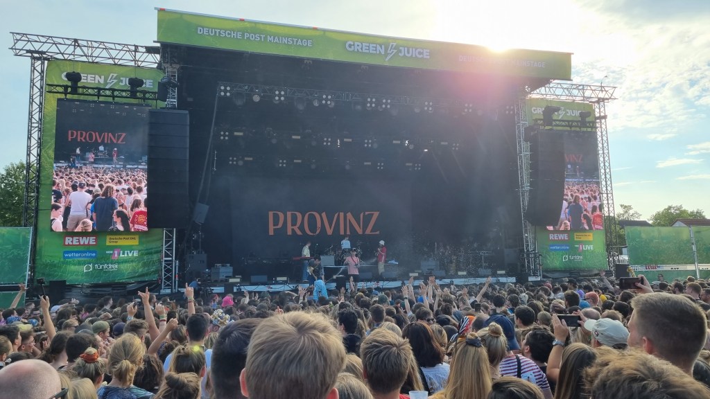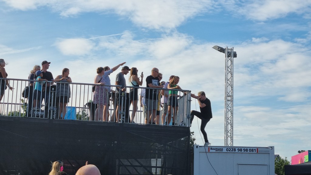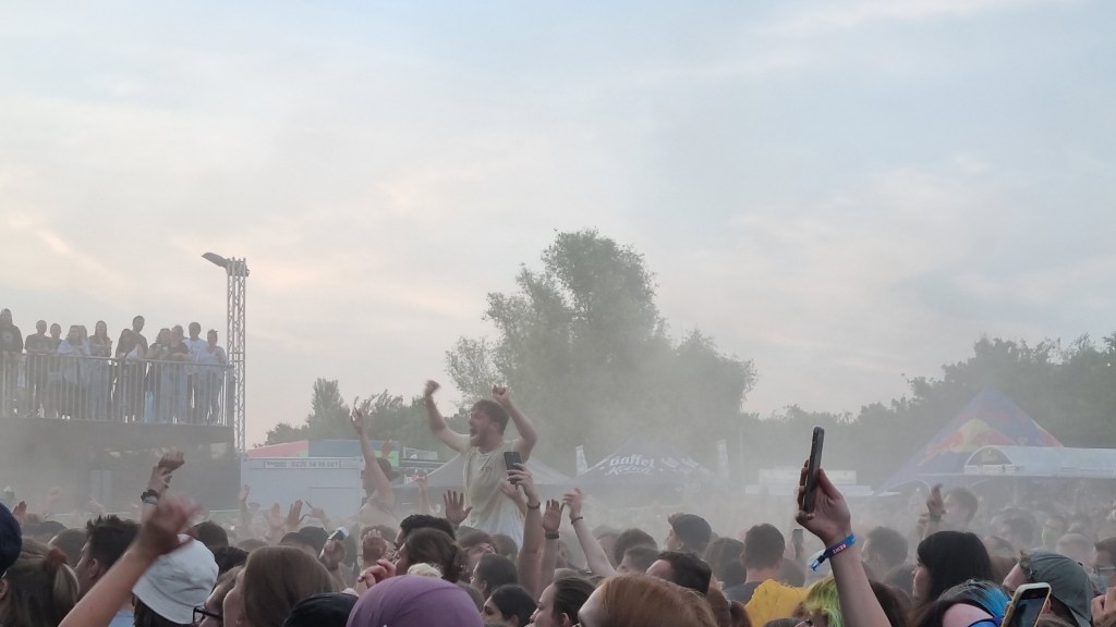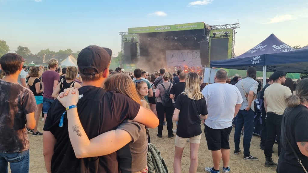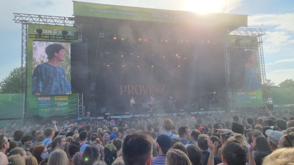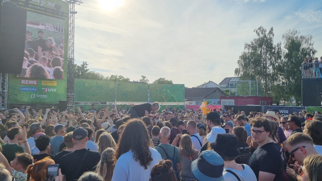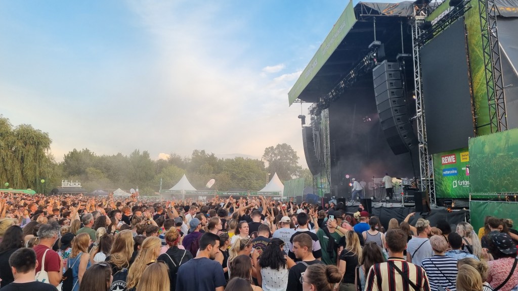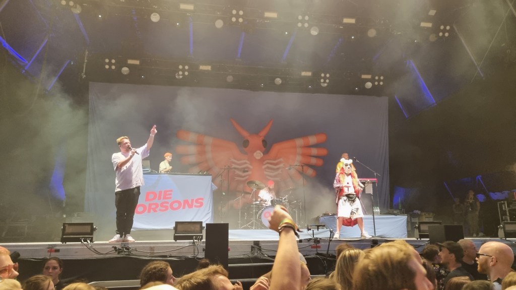 Der zweite Festivaltag startete entspannter und sonnig. Bis es vor dem Auftritt von Provinz zu einem Stromausfall kam. Zunächst kam es nur auf den Toiletten und an einigen Ständen zu kleinen Problemen, beziehungsweise Schlangen. Doch dann fielen während des Songs „Liebe zu dritt“ alle Lichter, Verstärker und Bildschirme aus und die Band Provinz stand auf der dunklen Bühne. Die Festivalbesucher:innen, die den Refrain mitgesungen hatten, waren weiter zu hören und ließen sich nicht beirren. Sie sangen einfach weiter und das für mehrere Minuten. Die Band war sichtlich gerührt und es entstand ein magischer Moment. Nach wenigen Minuten war der Strom wieder da, bis er dann nach einigen Songs wieder abgeschmiert ist. Auch beim zweiten Mal reagierte das Publikum erstaunlich gelassen, zwar ging ein Raunen durch die Reihen, doch dann sangen alle weiter, starteten erneut einen Moshpit und ließen die Stimmung nicht abfallen. Als der Strom dann wieder da war, bedankte sich die Band gerührt und auch die Veranstalter:innen waren mehr als froh, dass die Besucher:innen so sympathisch und entspannt reagiert haben. Bei dem nächsten Auftritt von Leoniden war von dem Zwischenfall nichts mehr zu merken. Professionell und mit einer guten Show brachte die Band dem Publikum gute Laune und die Fans, die an ihren Bandtshirts zu erkennen waren, sind zufrieden. Der Festivaltag endet mit einer besonders beeindruckenden Show von den Orsons, die richtig gute Laune verbreiteten. Die Stuttgarter Hip-Hop-Gruppe ist bekannt für ihre Ironie, Fantasie und Sarkasmus und kann damit bei den Besucher:innen ordentlich punkten.
