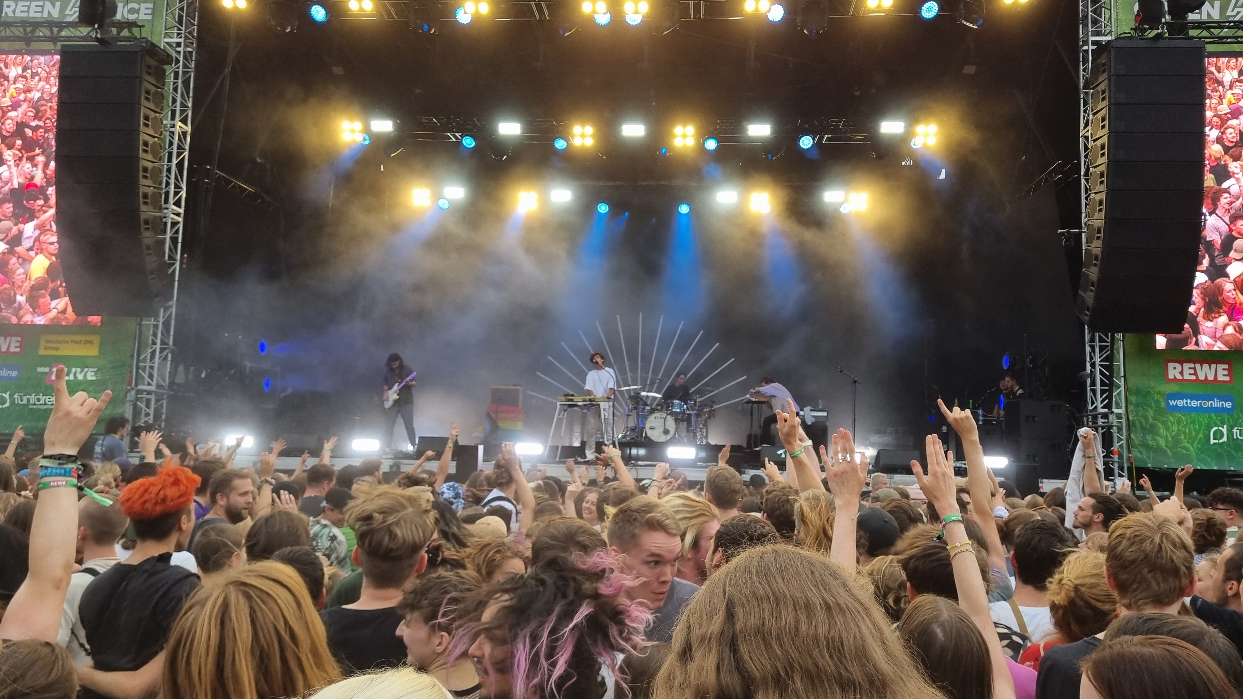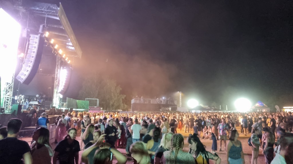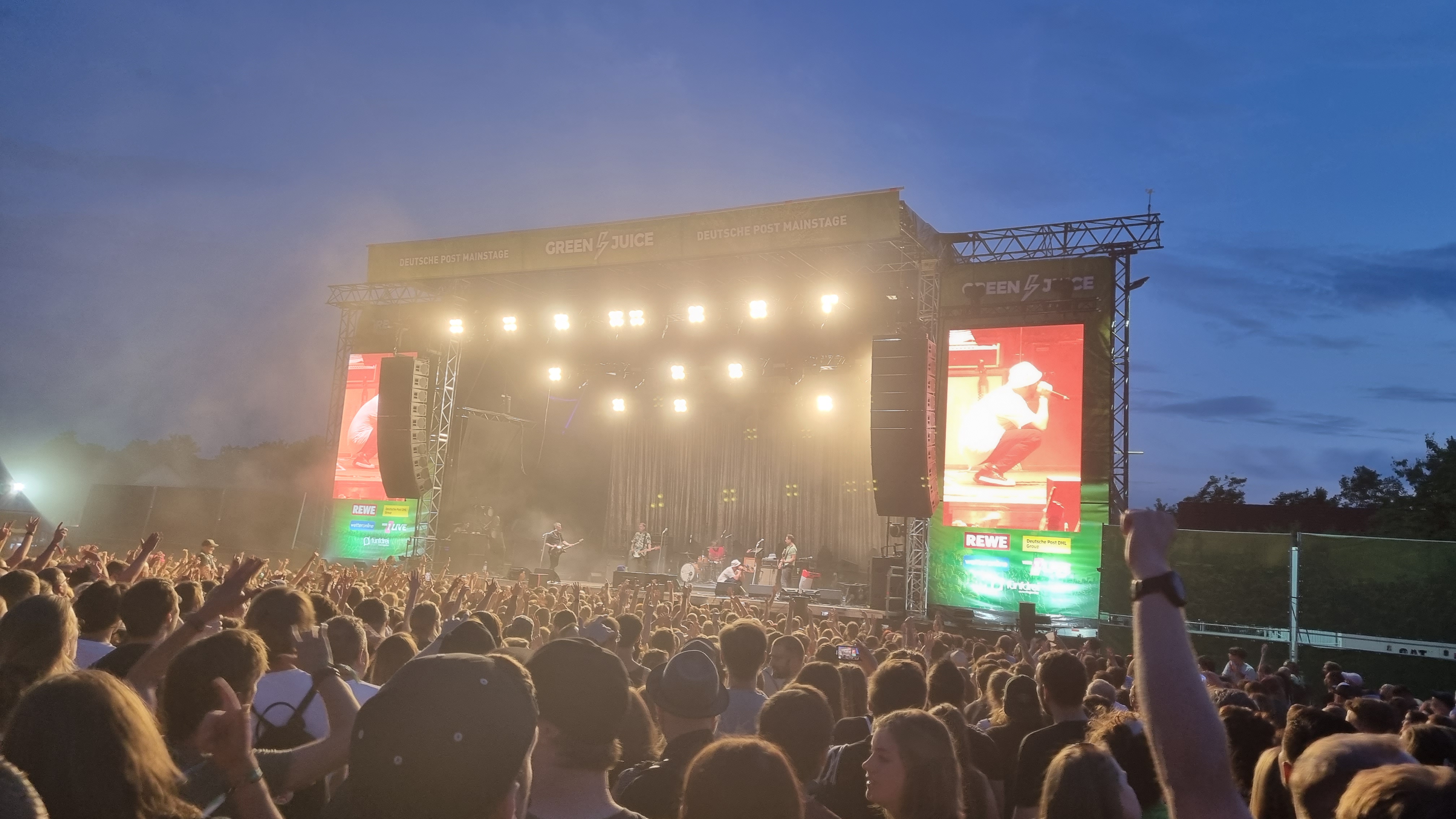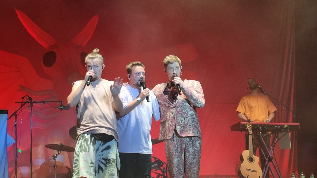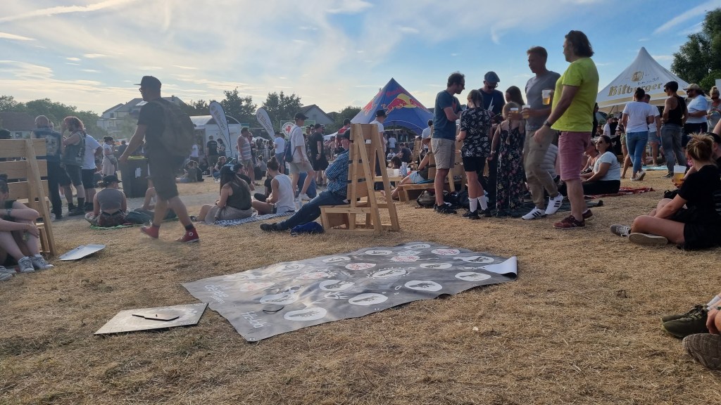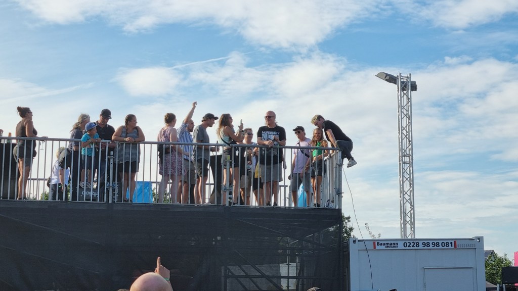 Der zweite Festivaltag startete entspannter und sonnig. Bis es vor dem Auftritt von Provinz zu einem Stromausfall kam. Zunächst kam es nur auf den Toiletten und an einigen Ständen zu kleinen Problemen, beziehungsweise Schlangen. Doch dann fielen während des Songs „Liebe zu dritt“ alle Lichter, Verstärker und Bildschirme aus und die Band Provinz stand auf der dunklen Bühne. Die Festivalbesucher:innen, die den Refrain mitgesungen hatten, waren weiter zu hören und ließen sich nicht beirren. Sie sangen einfach weiter und das für mehrere Minuten. Die Band war sichtlich gerührt und es entstand ein magischer Moment. Nach wenigen Minuten war der Strom wieder da, bis er dann nach einigen Songs wieder abgeschmiert ist. Auch beim zweiten Mal reagierte das Publikum erstaunlich gelassen, zwar ging ein Raunen durch die Reihen, doch dann sangen alle weiter, starteten erneut einen Moshpit und ließen die Stimmung nicht abfallen. Als der Strom dann wieder da war, bedankte sich die Band gerührt und auch die Veranstalter:innen waren mehr als froh, dass die Besucher:innen so sympathisch und entspannt reagiert haben. Bei dem nächsten Auftritt von Leoniden war von dem Zwischenfall nichts mehr zu merken. Professionell und mit einer guten Show brachte die Band dem Publikum gute Laune und die Fans, die an ihren Bandtshirts zu erkennen waren, sind zufrieden. Der Festivaltag endet mit einer besonders beeindruckenden Show von den Orsons, die richtig gute Laune verbreiteten. Die Stuttgarter Hip-Hop-Gruppe ist bekannt für ihre Ironie, Fantasie und Sarkasmus und kann damit bei den Besucher:innen ordentlich punkten.