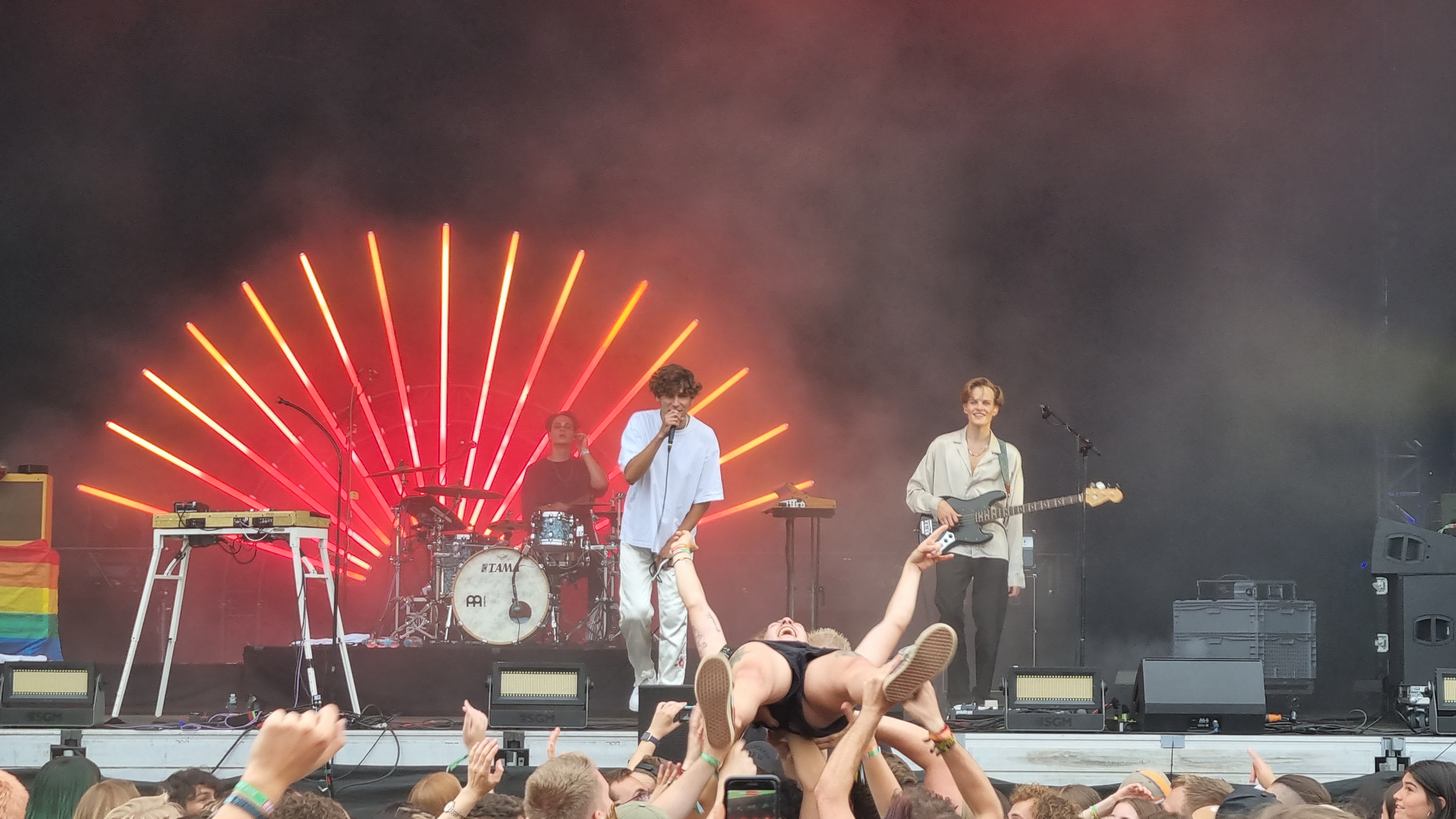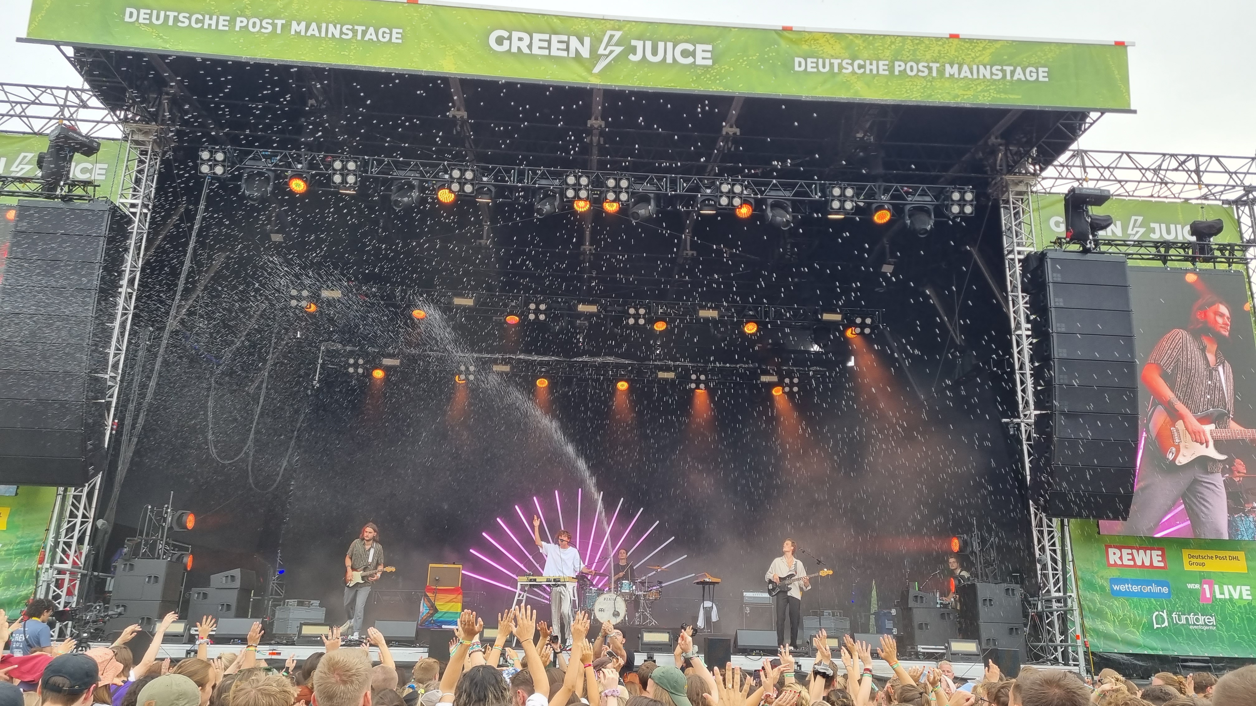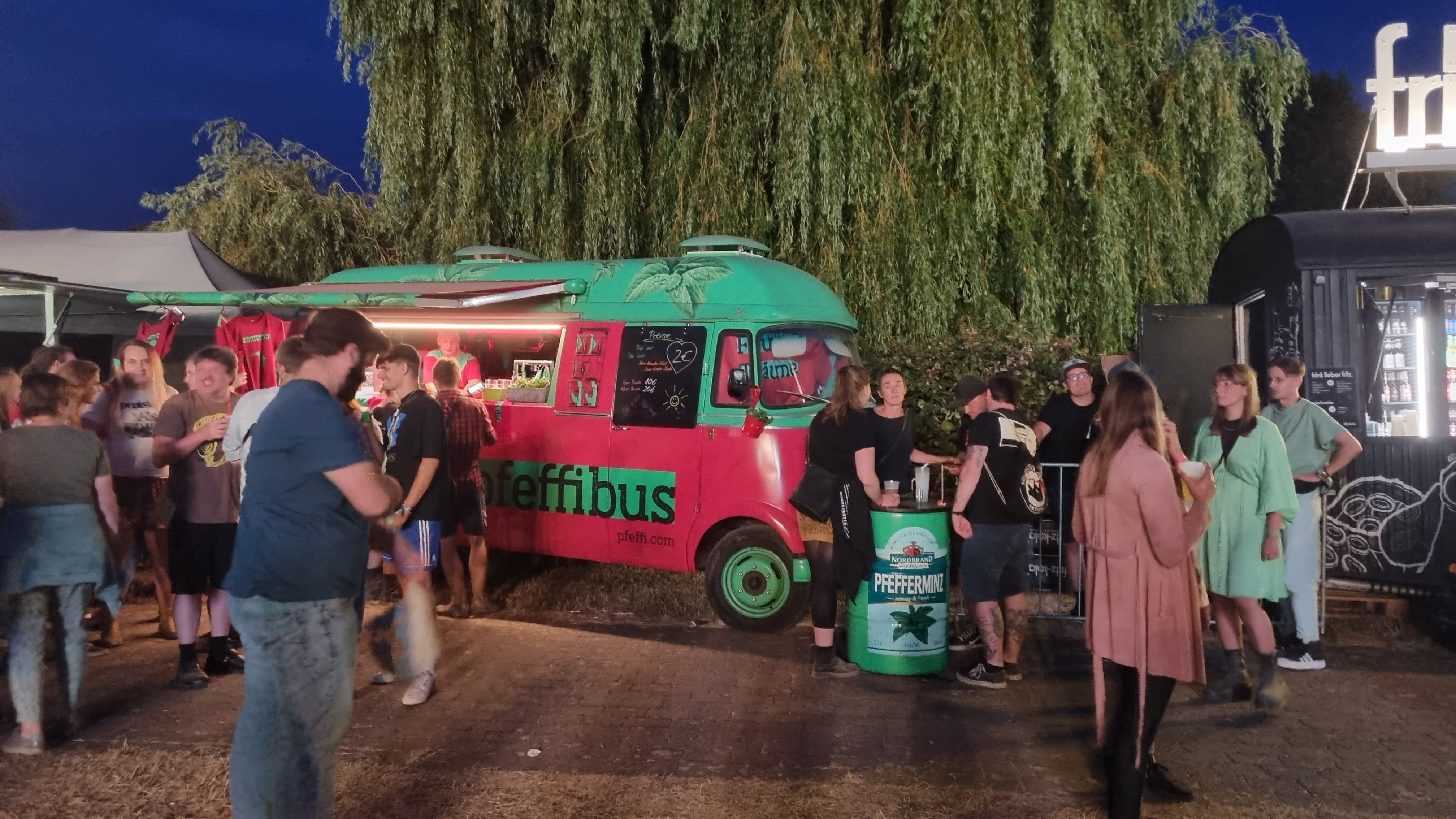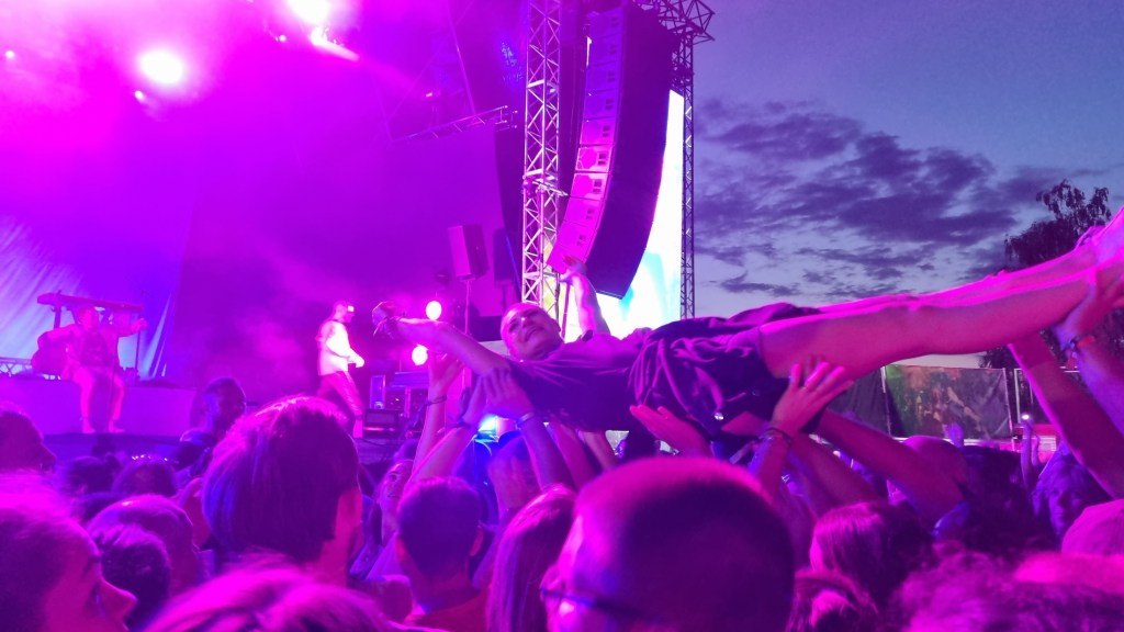Der zweite Festivaltag startete entspannter und sonnig. Bis es vor dem Auftritt von Provinz zu einem Stromausfall kam. Zunächst kam es nur auf den Toiletten und an einigen Ständen zu kleinen Problemen, beziehungsweise Schlangen. Doch dann fielen während des Songs „Liebe zu dritt“ alle Lichter, Verstärker und Bildschirme aus und die Band Provinz stand auf der dunklen Bühne. Die Festivalbesucher:innen, die den Refrain mitgesungen hatten, waren weiter zu hören und ließen sich nicht beirren. Sie sangen einfach weiter und das für mehrere Minuten. Die Band war sichtlich gerührt und es entstand ein magischer Moment. Nach wenigen Minuten war der Strom wieder da, bis er dann nach einigen Songs wieder abgeschmiert ist. Auch beim zweiten Mal reagierte das Publikum erstaunlich gelassen, zwar ging ein Raunen durch die Reihen, doch dann sangen alle weiter, starteten erneut einen Moshpit und ließen die Stimmung nicht abfallen. Als der Strom dann wieder da war, bedankte sich die Band gerührt und auch die Veranstalter:innen waren mehr als froh, dass die Besucher:innen so sympathisch und entspannt reagiert haben. Bei dem nächsten Auftritt von Leoniden war von dem Zwischenfall nichts mehr zu merken. Professionell und mit einer guten Show brachte die Band dem Publikum gute Laune und die Fans, die an ihren Bandtshirts zu erkennen waren, sind zufrieden. Der Festivaltag endet mit einer besonders beeindruckenden Show von den Orsons, die richtig gute Laune verbreiteten. Die Stuttgarter Hip-Hop-Gruppe ist bekannt für ihre Ironie, Fantasie und Sarkasmus und kann damit bei den Besucher:innen ordentlich punkten.