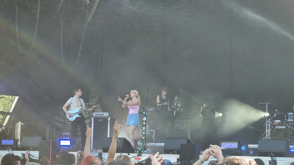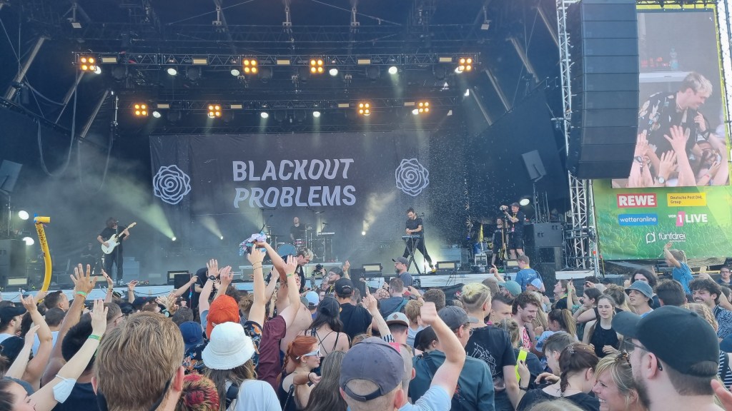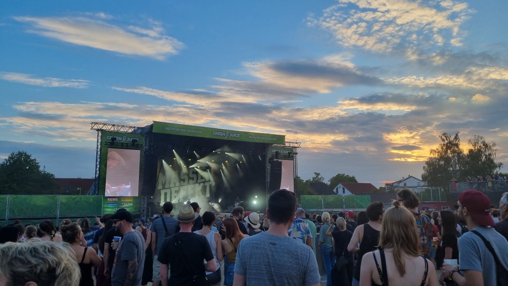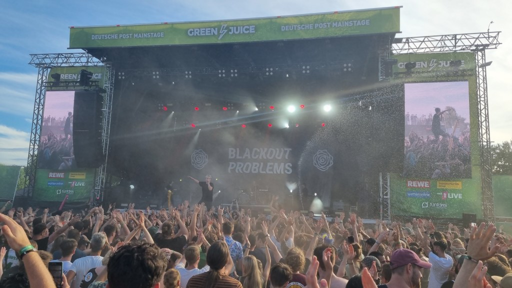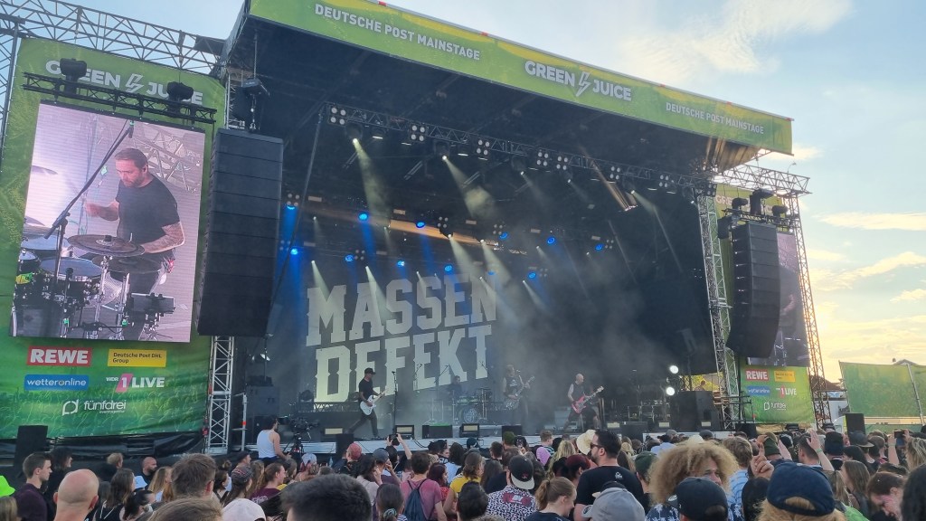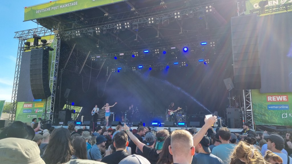 Besonders überrascht hat der Auftritt von Mia Morgan. In ihren rockigen Pop-Songs singt sie über das Erwachsenwerden, Feminismus und anderen Gesellschaftsthemen und das auf eine besonders empowernde Art. Auch in ihren Ansagen zwischen den Songs wirkte sie sehr sympathisch und bekam viel Zustimmung und Applaus vom Publikum. Auch auf der kleineren DJ-Bühne ging es am letzten Tag nochmal so richtig ab. Festivalbesucher:innen, die sich vor der Mainstage noch nicht genug ausgepowert hatten, fanden hier in den Pausen Techno-Sounds mit viel Bass. Die beste Show bot am Samstag die Band Blackout Problems. Die alternative Rockband aus München legte von der ersten Sekunde an richtig los. Frontsänger Mario Radetzky hat ein eindrucksvolles Stimmvolumen, das das Publikum sogar aus nächster Nähe hören durfte. Zunächst gesellte er sich mitten in einen Kreis vor der Bühne, dann ließ er sich vom Publikum bis nach hinten zur VIP-Bühne tragen und kletterte über einen Container hoch. Die Fans waren begeistert und feierten ihn für seine Show mitten zwischen ihnen. Auch Radetzky gefiel die Energie des Publikums und er rief kurzerhand dazu auf, dass möglichst viele durchs Stagediving zu ihnen nach vorne kommen sollen. Die Sicherheitsleute vor der Bühne hatten einiges zu tun, denn das ließen sich die Festivalbesucher:innen nicht zweimal sagen. Etwas entspannter, aber trotzdem genauso laut und basslastig ging es bei der Band Massendefekt weiter. Es wurde mit tiefen Stimmen gegrölt und im Takt mit dem Kopf gewippt. Immer wieder wurde ordentlich gehüpft und ein Wasserschlauch spritzte von vor der Bühne aus in die Menge. Es gab am Ende des Tages wohl kaum jemanden, der keinen Staub im Gesicht oder auf den Schuhen hatte.