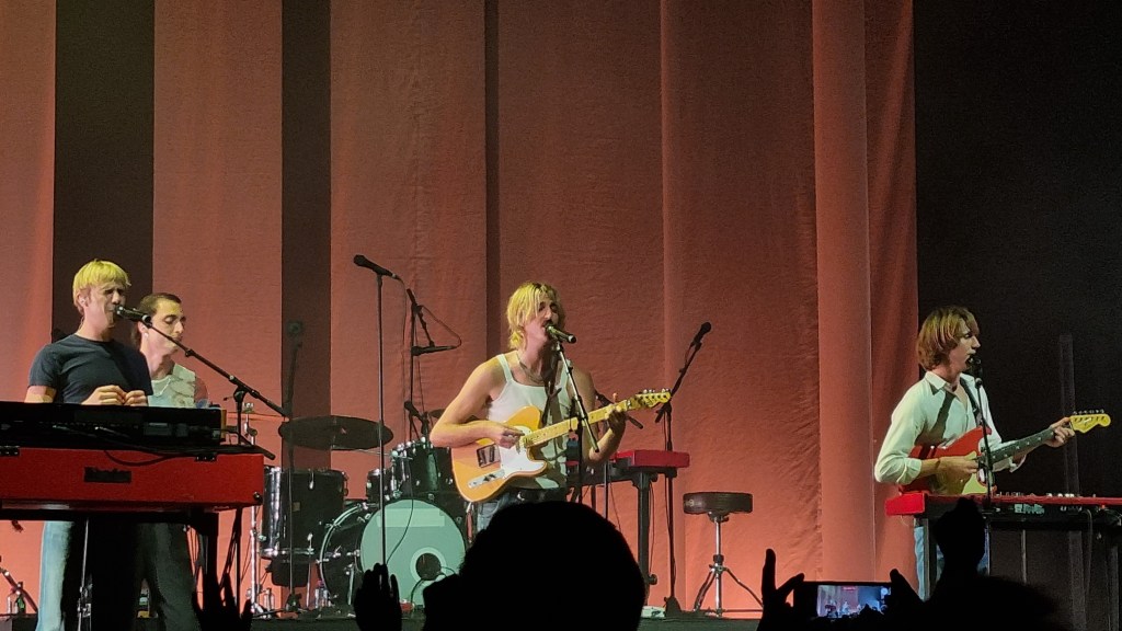 Von der ersten Sekunde an überzeugten das Bühnenbild und die Showeffekte rund um den Auftritt von Parcels. Die ursprünglich aus Australien kommende Band, bestehend aus Louie Swain (Keyboard), Patrick Hetherington (Keyboard), Noah Hill (Bass), Anatole Serret (Schlagzeug) und Jules Crommelin (Gitarre), kam mit lässigen Outfits auf die Bühne, wo sie sich zunächst gegenüberstanden und mit wild flackerndem Licht ausgeleuchtet wurden. Der Elektro-Pop Sound veranlasste sowohl Band als auch die Fans dazu, sich im Takt zu bewegen. Hinter der Band drehte sich die Wand, wodurch ein interessantes Schattenspiel entstand, das den Raum auf der Bühne optisch vergrößerte.