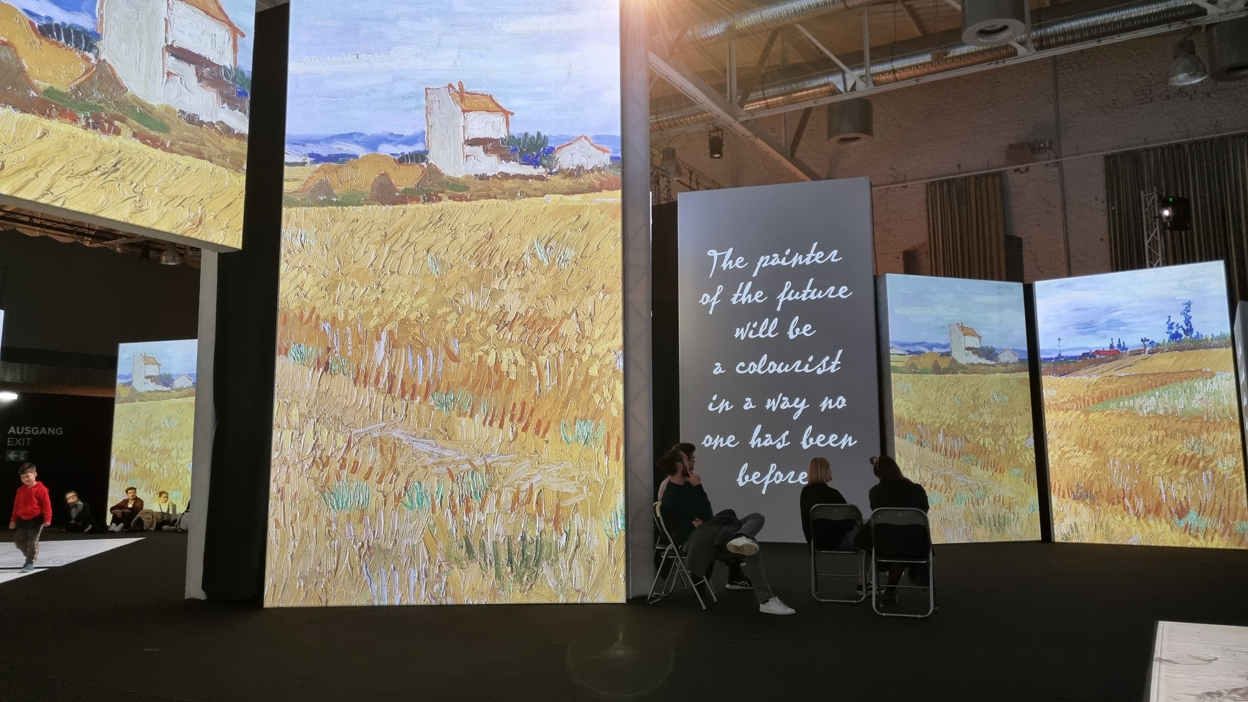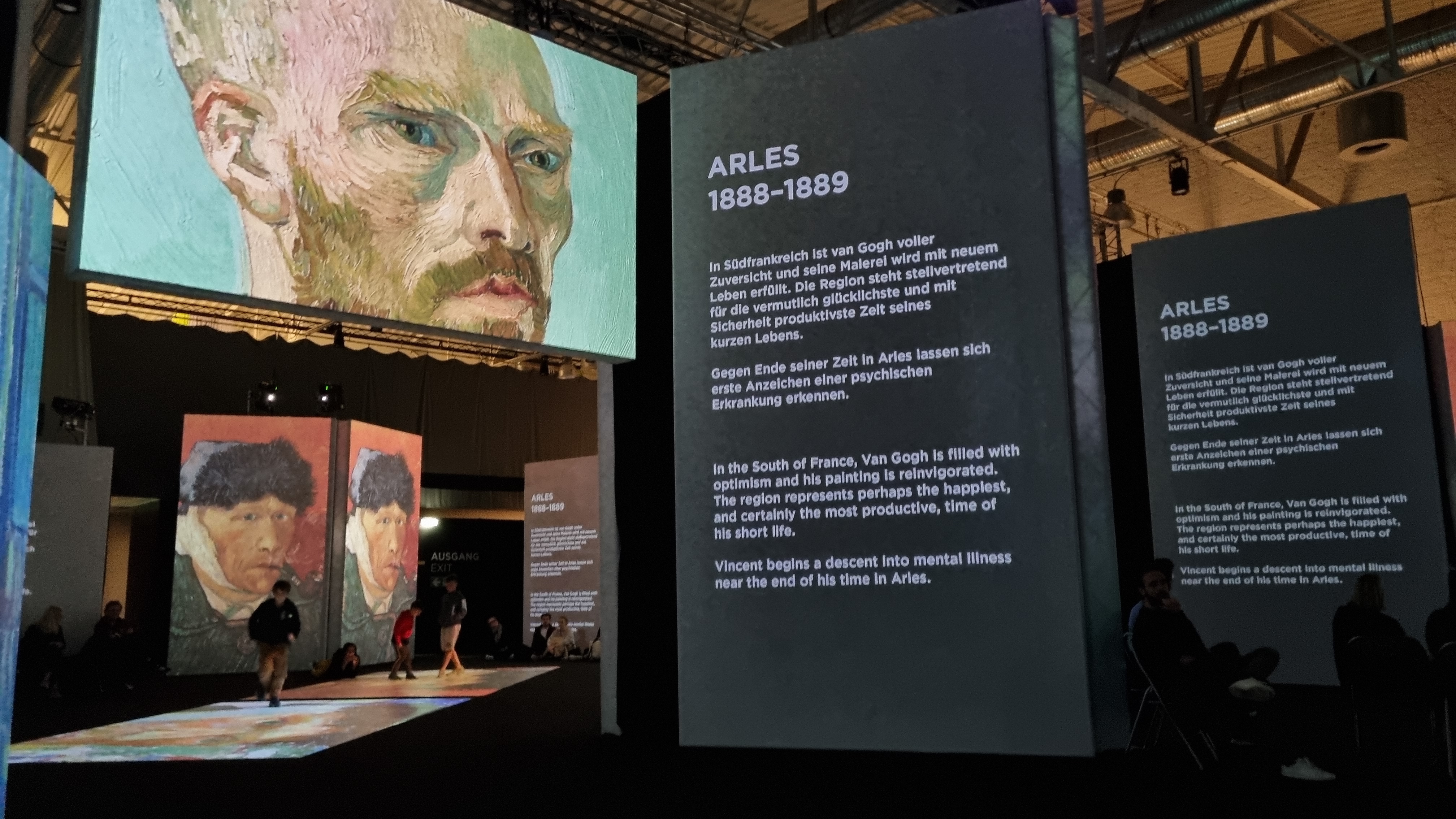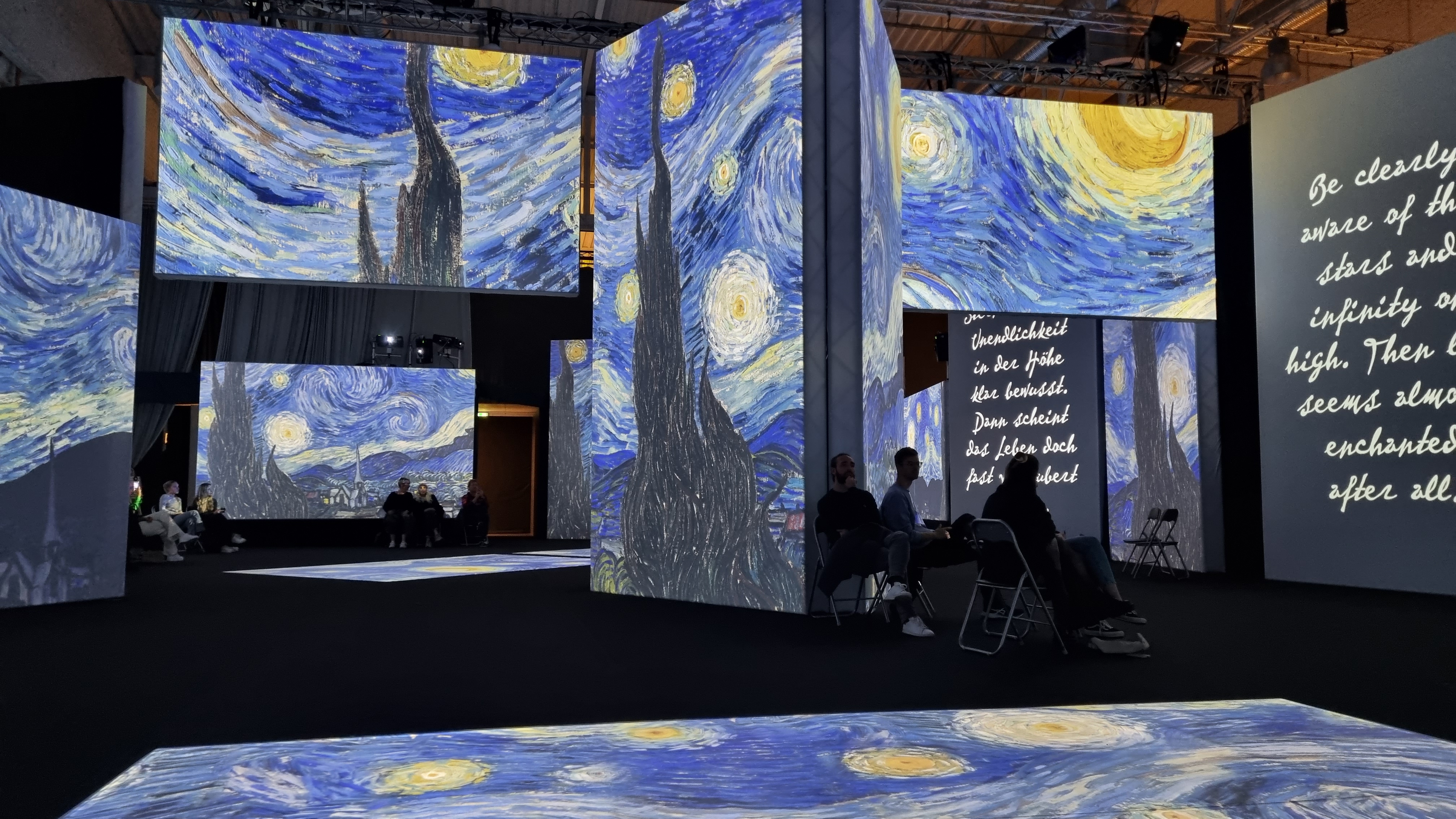 Durch die Bewegung und die Musik kann man bei der Ausstellung schnell mal vergessen, wo man sich gerade befindet. Die ungewöhnliche Art des Präsentierens sorgt sowohl bei Älteren als auch Jüngeren für Bewunderung. Immer wieder hört man Zuschauer:innen, die andere Besucher:innen auf Besonderheiten auf der Leinwand hinweisen, oder Kinder, die auf den Bodenprojektionen spielen. Van Gogh Alive wurde von Grande Experiences entwickelt und wirbt mit einem kontaktlosen digitalen Kunsterlebnis, das den Besucher:innen die einmalige Gelegenheit bietet, in Van Goghs Kunst einzutauchen und sich in seine Welt zu begeben. Das ist ihnen mit über 3.000 Bildern gelungen.