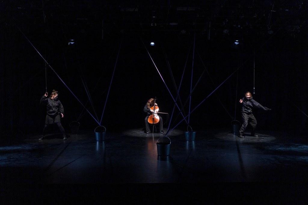Nachdem sich alle Zuschauer:innen auf der kleinen Tribüne zurecht geruckelt haben, wird es erst einmal still. Erwartungsvoll richten sich alle Augen auf die Bühne, auf der mehrere große Eimer verteilt sind. Durch ein Netz aus Bändern sind die Eimer mit den Traversen an der Bühnendecke verbunden. Hervorgehoben durch Lichtspots, sitzen bzw. liegen drei Frauen auf der Bühne.
