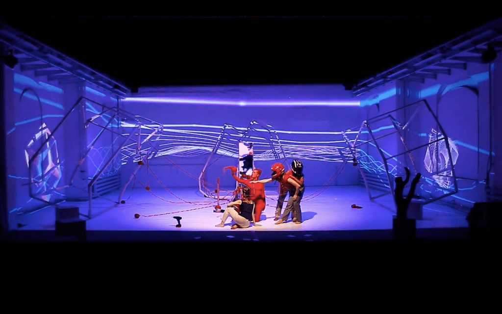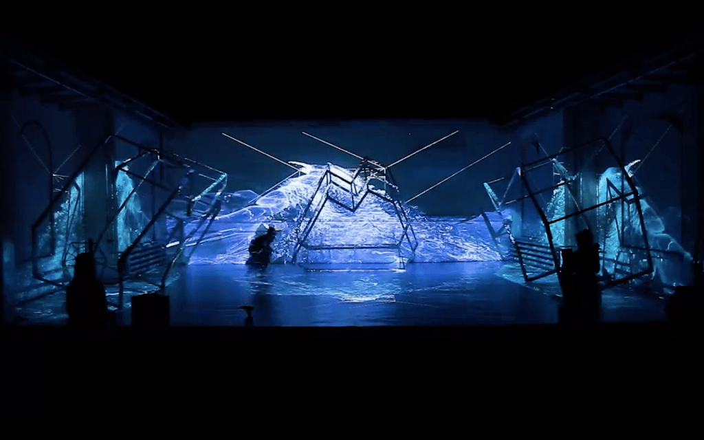 Der Tanz wird durch eine Multimedia Show an den Wänden begleitet. Zunächst startet sie zaghaft. Es befinden sich projizierte Linien an den Wänden und ein dumpfer Klang erinnert an das Gefühl unter Wasser zu sein. Der Inhalt der Videoprojektion wird immer nahbarer, es werden geometrische Figuren, die an einen Eisberg erinnern oder Bilder aus Venedig gezeigt und die Tänzer:innen nehmen Bezug zu den Bildern. Die schon zu Beginn auf der Bühne vertreilten Holzrahmen, die skelettierte Villen darstellen, werden zu einem großen Gerüst zusammengeschoben, dass ebenfalls an einen Eisberg erinnert. Der inhaltliche Bezug zum Klimawandel und dem steigendem Meeresspiegel ist direkt präsent. Zudem sorgt später József Iszlai mit sphärischer Livemusik für die richtige Stimmung. Die Tänzer:innen tanzen zum Sound seiner E-Gitarre. Besonders hängengeblieben ist die Nutzung von medizinischen Tropf-Säcken. Aus ihnen werden Wassertropfen auf verschiedene Gegenstände fallen gelassen und erzeugen dabei unterschiedliche Klänge, die dann wiederum verzehrt werden, sodass ein außerweltlicher Beat erzeugt wird. Jeder Tropfen bekommt einen Sound und bekommt dadurch Bedeutung. Venedig hängt am Tropf. Es geht immer wieder um das Leben und den Tod.