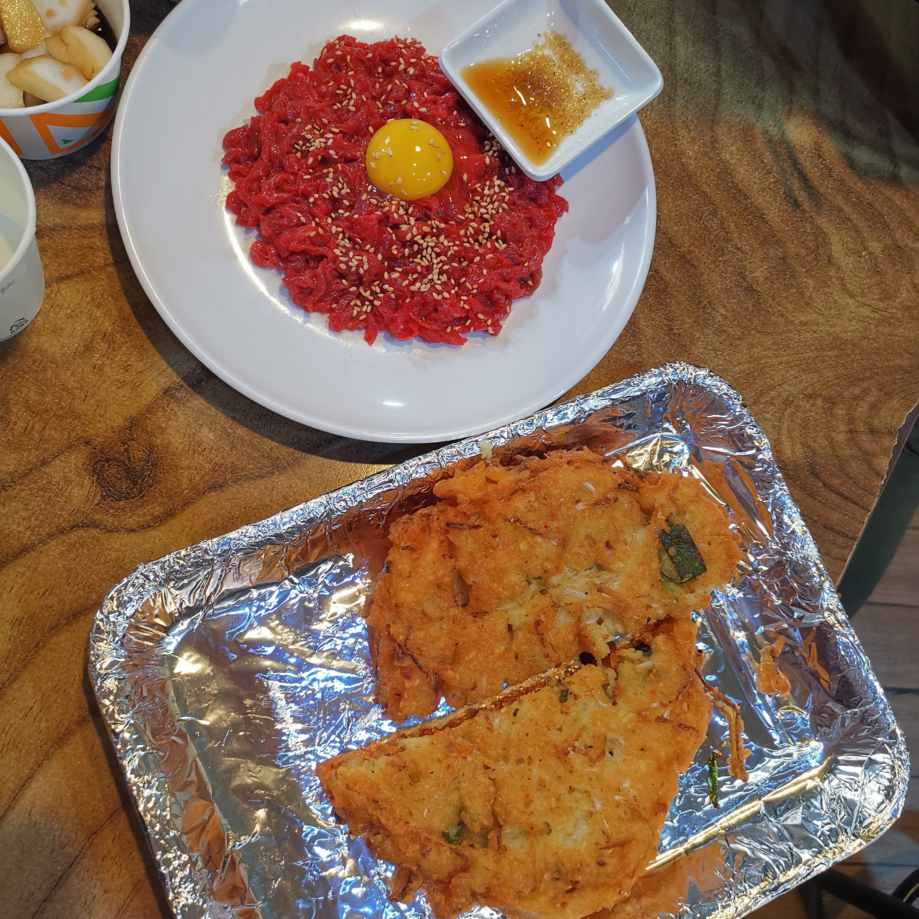 Auf dem Bild zu sehen von links oben nach rechts: Hoe und Mungobohnenpfannkuchen, Korean Fried Chicken, Baffle, Kalguksu