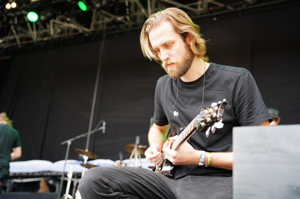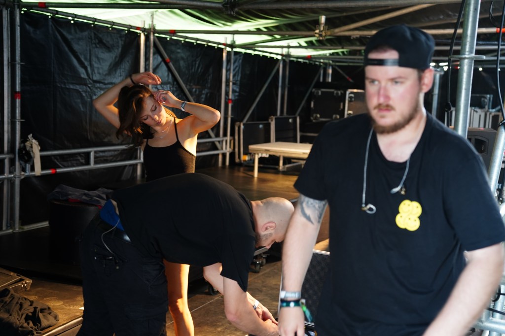 Viel Zeit zum Entspannen bleibt am Anreisetage jedoch nicht. Denn der Campingplatz öffnet am ersten Tag des Festivals. Also geht es für alle ab in Richtung Gelände. Da geht es natürlich zum Artist Ticketing und schnell haben sie ihr Festivalbändchen. Nach der Taschenkontrolle erblicken sie die Bühne. „Schon groß“, sagt Nico. Die Aufregung steigt für einen kleinen Moment. An den Seiten der Bühne sind Bildschirme angebracht. Das wirkt direkt viel größer als die Bühnen in kleinen Clubs, wo sie sonst auftreten. Den Schlagzeuger kann man da oft nicht sehen, weil er ohne Podest hinter seinen Bandmitgliedern verschwindet. Auf der Bühne ist das kein Problem. Es gibt ein Podest fürs Schlagzeug und Kameras, die Nahaufnahmen des Konzerts auf den Bildschirmen übertragen.