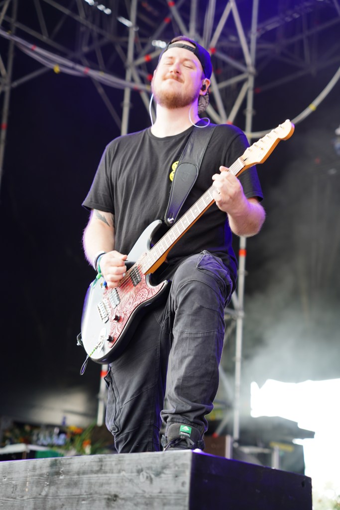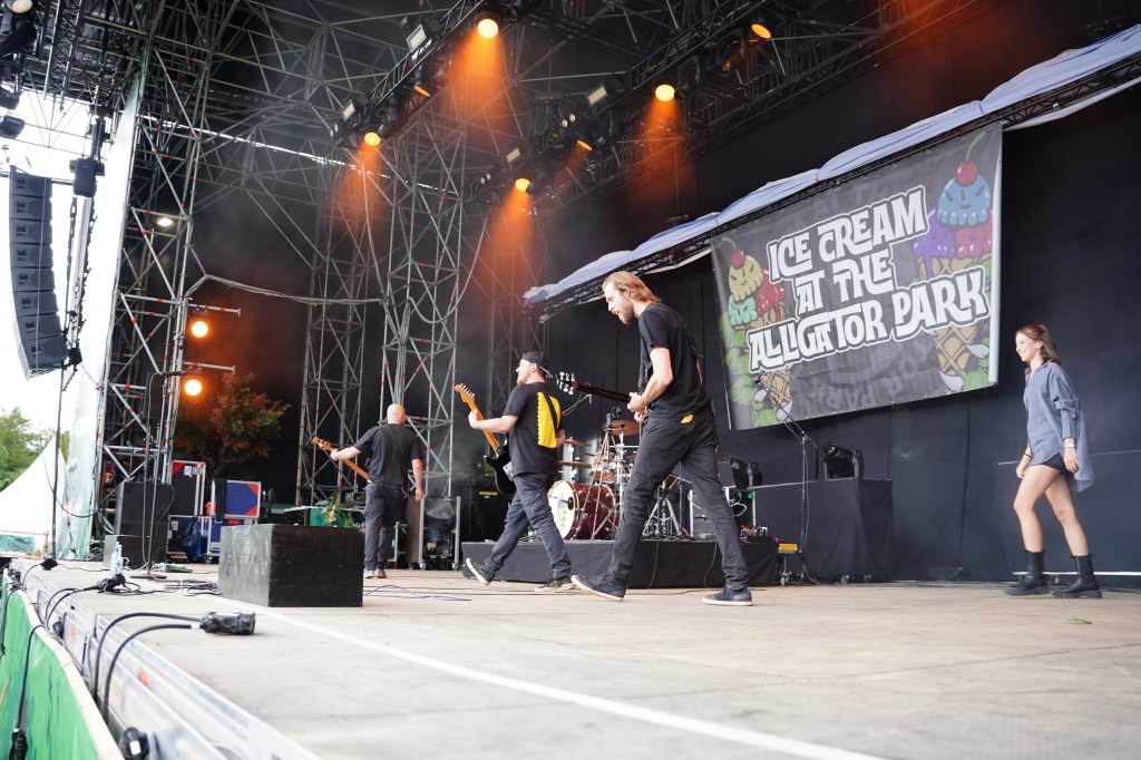Es ist Samstag. Today is the day. Morgens scheint tatsächlich mal die Sonne und das sogar länger als fünf Minuten. Einige Festivalbesucher:innen nutzen das sofort aus und gehen ins Freibad. Für ICATAP geht es Backstage. Bassist Felix und Gitarrist Lukas aka Cino stoßen dazu und damit ist die Band vollständig. Gestern gab es für die einen noch Dosenravioli, heute gibt es Catering, eine warme Dusche und sogar Physio. Dafür bleibt aber leider keine Zeit. Es gibt zu viel tu tun und zu gucken. Vor ihnen spielen die Rogers und das Gelände ist für 12:30 Uhr schon sehr gut gefüllt. Sie spielen ihren letzten Ton und die Menge jubelt. Die Hoffnung der Band war es, dass die Rogersfans vor der Bühne bleiben, aber sie verlassen die Fläche und es wird leerer. Eine Gruppe von Menschen geht dafür jedoch zielstrebig vor die Bühne. Eins haben sie alle gemeinsam: Irgendwo an ihrem Outfit findet man einen Alligator. Freunde und Familie von ICATAP sind natürlich da, um ihre Alligatoren zu unterstützen. So auch Lukas Eltern. Die müssen eigentlich auf ihre Enkelin aufpassen und deswegen hätte sich eine Tageskarte vom Preis her nicht gelohnt. Als letzten Versuch haben Sie einen Tag vorher die Veranstalter angeschrieben, ob es nicht vergünstigte Tickets gibt, da sie ja nur eine halbe Stunde bleiben können, erzählen sie. Am Samstagmorgen erhalten sie dann den Anruf, dass sie auf der Gästelist stehen – mit Enkelin natürlich.