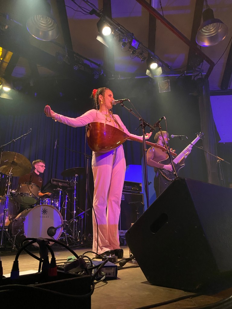 Die Uhrzeit einmal nicht im Blick, und zack, hält man den Soundcheck für ein viel zu wenig besuchtes und deshalb direkt abgebrochenes Konzert. Die Verwirrung klärt sich und ein paar Minuten nach dem richtigen Beginn ist der große Saal des Bürgerzentrums Ehrenfeld voll mit begeistert tanzenden Menschen, die sich über die energiegeladene Show von Aysay freuen. Die tolle Musikmelange aus türkischen und kurdischen Liedern, gemischt mit Rock- und Electro-Versatzstücken überzeugt uns vom ersten Ton an. Frontfrau Luna Ersahin kann mit ihren Tanzeinlagen alle zum mitschwingen bewegen, ohne dass es groß Aufforderungen bedarf. Aber auch die Spielkunst ihrer Bandkollegen Aske Døssing Bendixen (Drums, Percussions) und Carl West Hosbond (Gitarre) kann sich hören lassen. Die Stimmung ist ausgelassen, es wird Dabke getanzt und man fühlt sich automatisch mit den anderen im Publikum sehr verbunden. Ein wirklich toller Abschluss für unseren Freitag.