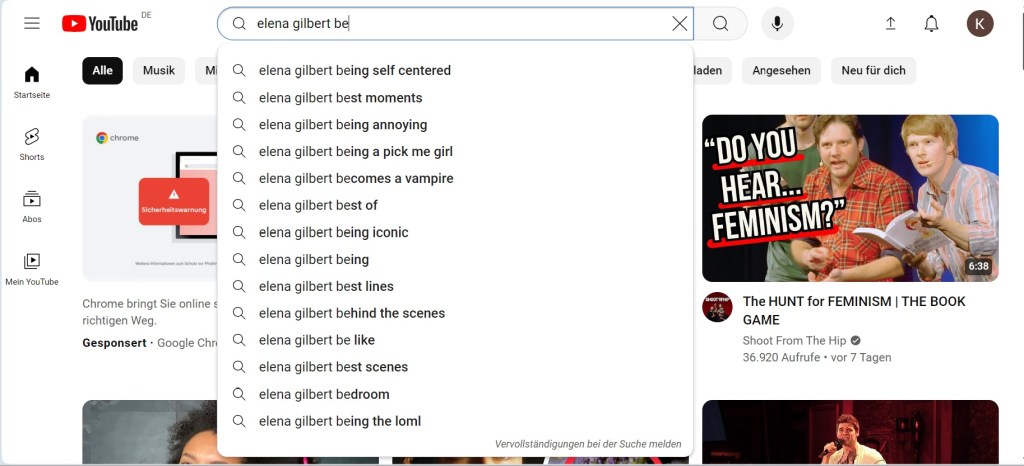 Deshalb habe ich mir klassische Stereotype in Teeniefilmen angeschaut. Keiner scheint jedoch so richtig zu passen. Die Charaktere, die mich so nerven, sind in manchen Verhaltensweisen sehr unterschiedlich. Es könnte eine Mischung aus the girl next door und pick me girl sein. Die eine ist mehr der Underdog, die andere ist das IT-Girl der Schule. Eine ist sehr fleißig in der Schule, die andere ist damit beschäftigt, Vampire zu verjagen.