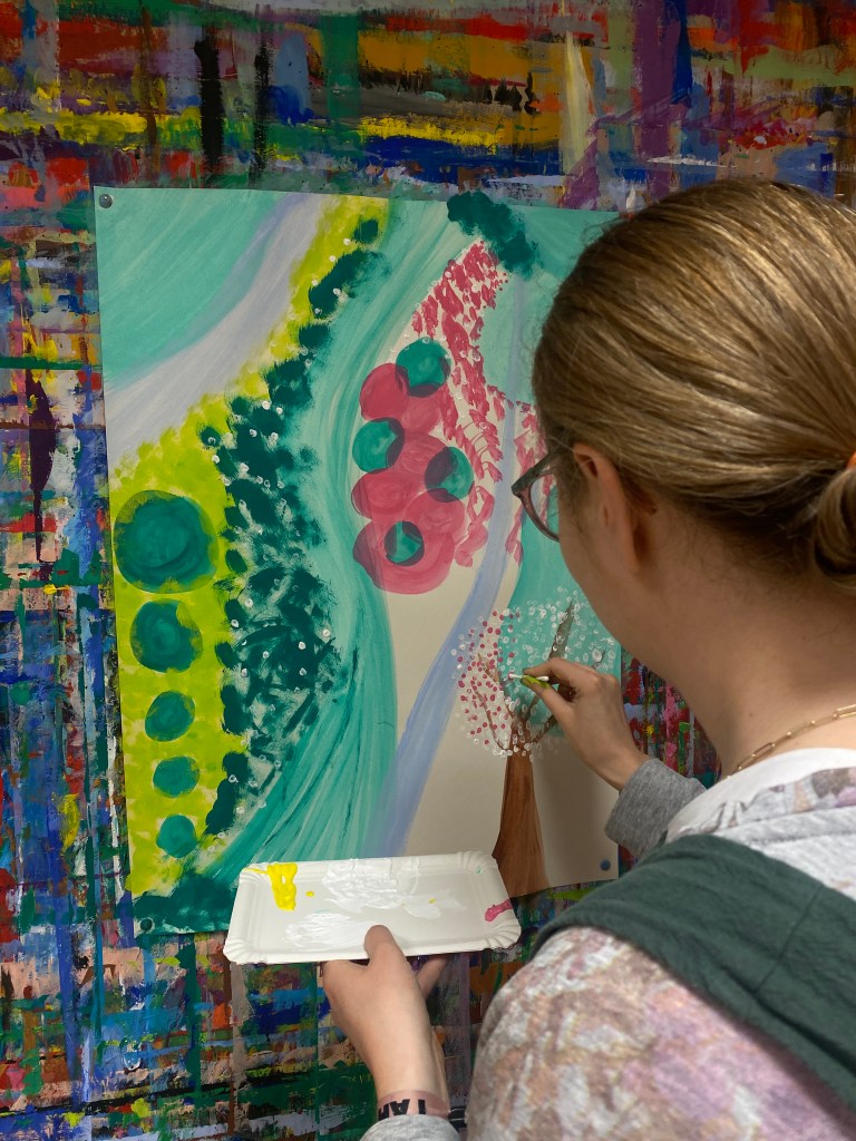 Gemeinsam mit Theresa war ich bei einem Malabend für Erwachsene. Einfach drauf lospinseln, Farben ausprobieren und kreativ sein. Theresa hatte nicht nur einen Plan bzw. eine Vorstellung, was sie genau malen wollte: Es sollte ein sommerlicher Wald werden. Bei mir ging es ohne konktete Vorstellung los, was ich eigentlich genau machen wollte. Mich begeisterten einfach die bunten Farben und ich wollte diese auf abstrakte Weise zusammenbringen. Je bunter, desto besser, aber gleichzeitig harmonisch, war mein Ziel. Denn auch ein wichtiges Learning beim Kreativsein: Der Spaß darf dabei nie verloren gehen. Es geht für mich nicht darum, dass das Endergebnis perfekt ist, sondern der Weg ist das Ziel. Bei mir liegen die Vorstellungen im Vorfeld doch sehr weit entfernt von dem, wie es dann tatsächlich aussieht. Aber das ist ok. Für mich ist der kreative Prozess ein leeres Blatt Papier zu gestalten und Pinselstrich um Pinselstrich aufzutragen, unglaublich entspannend und macht mich glücklich.