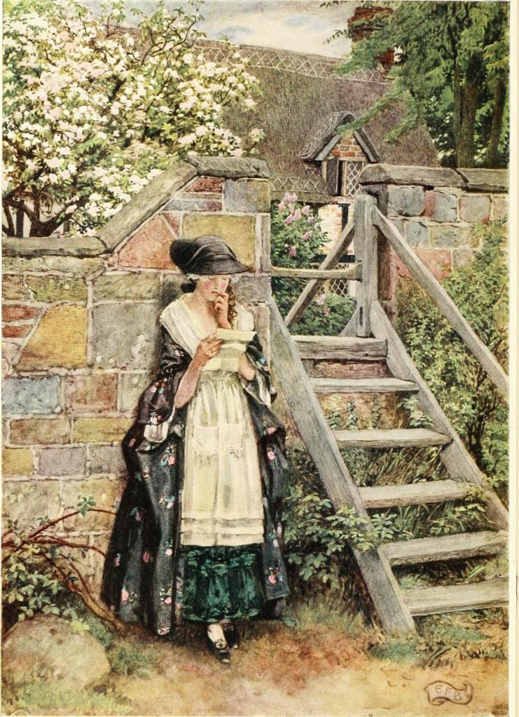 Der Roman erzählt die bewegende Geschichte von Dr. Primrose und seiner Familie, die durch Betrug, Verlust und gesellschaftliche Intrigen schwere Prüfungen durchleben, bevor sich ihr Schicksal durch Aufdeckung der Wahrheit und die Rückkehr zu Anstand und Gerechtigkeit zum Guten wendet. Er schildert Themen wie Liebe, Täuschung und moralische Integrität vor dem Hintergrund sozialer Unterschiede im ländlichen England. Olivia Primrose, die älteste Tochter des Pfarrers, gerät in den Bann des charmanten, aber skrupellosen Gutsherrn Thornhill. Sie flieht mit ihm, getäuscht von falschen Versprechungen einer Ehe. Nachdem sich Thornhills Heirat als Betrug entpuppt, verfällt Olivia in tiefe Scham und Verzweiflung. Ihr Vater sucht sie verzweifelt, findet sie schließlich und bringt sie nach Hause. Dort erwarten die Familie weitere Schicksalsschläge, doch letztlich wendet sich das Blatt: Thornhill wird entlarvt, und Olivia erfährt, dass ihre Ehe doch rechtsgültig ist. Ihre Ehre ist gerettet, während Thornhill seiner Taten überführt wird. Für mich sieht es so aus, als würde Olivia die Liebesbekundungen von Thornhill lesen. Auch hier ist das Lesen Teil der Kommunikation. Wie sie hier steht, ist es aber auch etwas, was sie heimlich tut. Das macht es romantisch. Es ist besonders spannend, weil Briefe natürlich ein schöner Austausch zwischen Liebenden sein können, in diesem Fall Thornhill Olivia aber ja betrogen hat. In diesem Kontext wirkt Olivia sehr naiv, was mit ihren roten Bäckchen noch deutlicher unterstrichen wird.