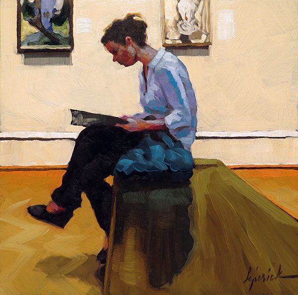 Es ist September, das Wetter wird wechselhaft und ob im Urlaub oder um dem Regen zu entfliehen: Es ist Zeit fürs Museum. Hier begegnen wir 2014 Karin Jurick, die eine Vorliebe dafür hat, die Besucher und Besucherinnen im Museum vor ikonischen Werken zu malen.